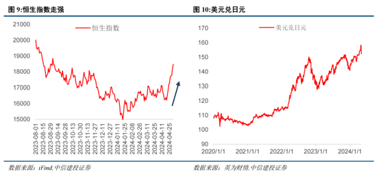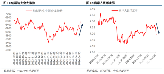 港股、美股中概股表现强势,离岸人民币走强。港股近期进入技术性牛市,持续表现强劲。一方面,近期日元大幅贬值,4月29日盘中,日元对美元汇率失守160关口,创34年以来的新低。日元资产吸引力下降,当前外资在亚太市场的配置重心从日本向港股转移,外资回流驱动港股走强。另一方面,当前中国经济运行积极因素增多,内生动能持续修复。本轮港股走强也显示出外资对于中国经济的乐观预期。同时,当前港股正处于价值洼地,性价比较高。此外,港股的强劲表现也对美股市场中概股产生了积极影响。5月2日纳斯达克中国金龙指数收盘价为6568.77,创2023年11月底以来的收盘新高,涨幅为6.01%,创2023年7月底以来的单日最大涨跌幅。同时,离岸人民币汇率走强,5月3日盘中,离岸人民币升破7.19,创出3月份以来最强水平。离岸人民币汇率受管制较少,更能够反映国际外汇市场波动。本次离岸人民走强,或反映出国际投资者对于中国经济向好的信心。