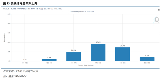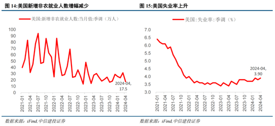 美国劳动力市场明显降温,降息窗口或将提前。北京时间5月3日晚,美国劳工部数据显示,美国4月季调后非农就业人口增17.5万人,远低于预期,是六个月以来的最小增幅,同时,失业率意外上升至3.9%。美国就业市场疲软或将导致降息窗口提前,根据芝商所FedWatch工具,非农数据披露后交易员将美联储首次降息时间预期从11月提前至9月,预计2024年美联储将2次降息25个基点,非农业数据公布前预期为1次。