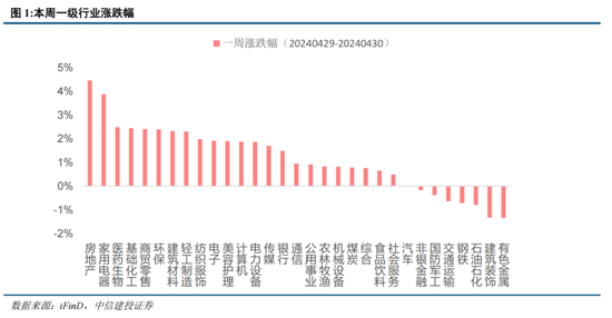 本周三大指数集体收涨。上证指数、深证成指、创业指数分别上涨 0.52%、1.30%、 1.90%。中证500、中证1000为代表的中小盘指数分别上涨1.28% 、1.50%。行业方面,31个申万一级行业,房地产(4.46%)、家用电器(3.87%)、医药生物(2.49%)、基础化工(2.45%)、商贸零售(2.40%)、环保(2.39%)、建筑材料(2.32%)、轻工制造(2.30%)涨幅居前,有色金属(-1.34%)、建筑装饰(-1.33%)、石油石化(-0.79%)领跌。市场风格维度,国证价值上涨0.55%,国证成长上涨1.04%,成长股占优。沪深300成分股中,科沃斯(19.31%)、凯赛生物(17.90%)、生益科技(15.57%)、浪潮信息(9.09%)、福斯特(8.88%)涨幅居前,长安汽车(-11.16%)、振华科技(-8.24%)、华域汽车(-7.15%)、大秦铁路(-6.99%)、中国中铁(-5.87%)领跌。