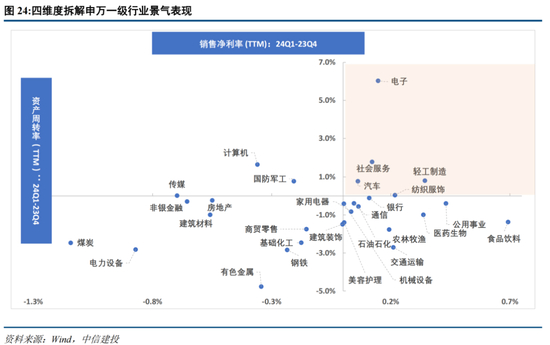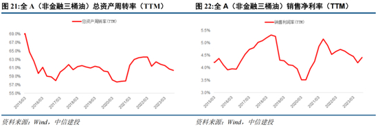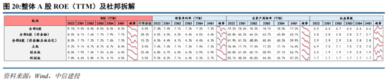 全部A股23Q4 ROE(TTM)达8.49%,24Q1达8.19%,环比下行0.30pct;其中销售净利率(TTM)23Q4达7.28%,24Q1(TTM)达7.19%,环比下行0.09pct;23Q4总资产周转率(TTM)达17.96%,24Q1达17.33%,环比下行0.63pct;23Q4权益乘数(杠杆率)达6.55,24Q1达6.61,环比上行0.05;