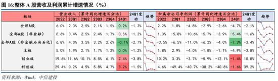 全部A股24Q1营收同比达0.2%,23全年同比1.5%,环比下行1.3pct;24Q1归属母公司净利润同比为-4.7%,23全年同比-2.6%,环比下行2.1pct;24Q1ROE(TTM)达8.2%,23Q4为8.5%,环比下行0.3pct;