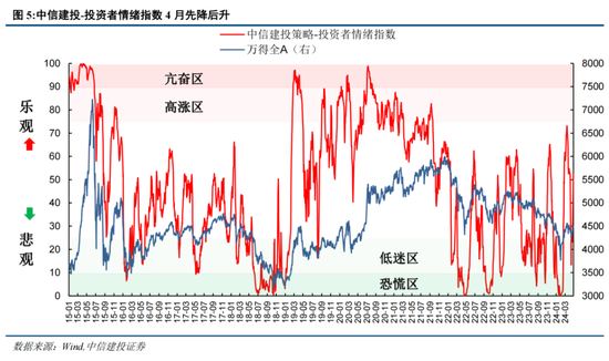 4月情绪指数先降回升,近期明显回暖。我们通常会在4月观察到市场情绪的回落,这往往与3月开工季数据披露、市场进入财报季、政治局会议政策预期兑现等因素有关。事实上,从3月底到4月上旬,投资者情绪指数一路下滑,4月16日最低降至接近13的水平,几乎跌入恐慌区。不过在多方面因素共同作用下,4月下旬情绪指数稳定在了25附近,月末更是出现了大幅攀升,做多热情大涨。
