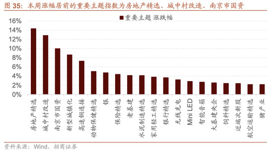 本周A股主要指数涨跌分化,创业板指数下跌0.70%,万得全A指数微涨0.06%,沪深300指数上涨0.32%。A股涨幅居前的重要主题指数为房地产精选、城中村改造、南京市国资。