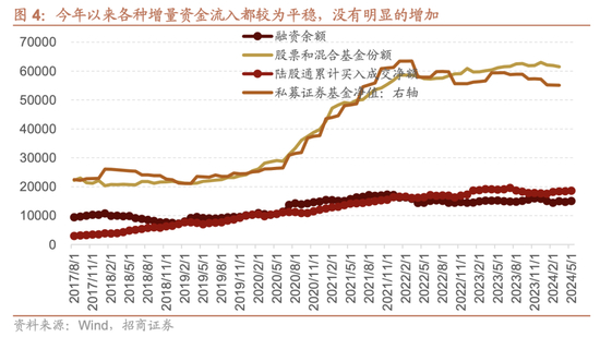 由于过去两年市场表现欠佳,居民进入权益市场的积极性下降,今年以来,除了北向资金净流入了878亿,ETF在重要机构投资者增持之下有所增加之外,主动偏股基金、私募基金规模较年初都没有增加,融资余额也小幅下降。因此,在这种情况下,市场仍以存量为主。