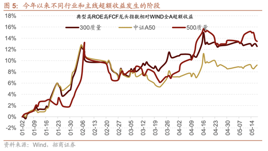 于是,我们就看到了类似300质量。500质量、中证A50为代表的高FCF高质量的指数,相对WIND全A的超额收益不断攀升。