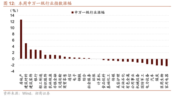 从行业上看,本周申万一级行业涨跌分化,房地产、建筑材料、建筑装饰涨幅居前,传媒、医药生物、家用电器跌幅居前。从涨跌原因看,本周上涨板块及主要原因:房地产(央行“三箭齐发”,地产政策持续超预期),建筑材料(房地产政策持续密集催化提振市场预期),建筑装饰(房地产政策持续密集催化提振市场预期),跌幅较大的行业原因,煤炭(焦煤期货下跌),医药生物(市场风格变化引起资金外流),家用电器(板块正常轮动调整)。