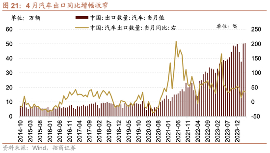 出口方面,4月汽车出口同比增幅收窄。根据中国汽车工业协会数据,4月份,汽车出口50.4万辆,环比增长0.4%,同比增幅收窄3.9个百分点至34%。