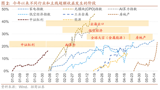 今年以来的行业和产业主线有些是预期范围内的,比如我们在年度策略报告中重点推荐的AI算力、地产链中的家电、工业金属等。也有些是年中出现了重大政策变化和加持,如低空经济、房地产。有些是此前市场普遍预期会继续有表现的高股息板块。此外,有一些是外部宏观环境变化带来的如出口、出海链,代表性是家电工程机械和纺服,以及全球定价大宗