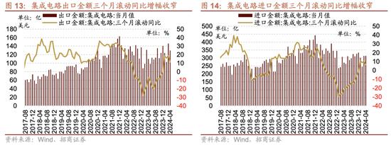 4月集成电路进、出口金额当月同比增幅扩大,当月贸易逆差扩大。4月集成电路出口金额为129.55亿美元,当月同比增幅扩大6.32个百分点至17.81%,累计同比增幅收窄0.60个百分点至19.10%,三个月滚动同比增幅收窄7.63个百分点至11.16%;4月集成电路进口金额为313.45亿美元,当月同比增幅扩大13.82个百分点至15.77%,累计同比增幅扩大1.60个百分点至11.90%,三个月滚动同比增幅收窄4.01个百分点至6.34%。当月贸易逆差环比增加10.37%至183.90亿美元。