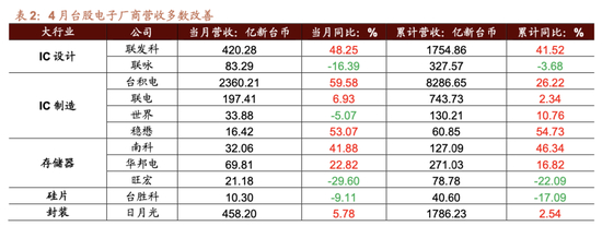 IC设计领域联发科4月份营收当月同比上行48.25%,增幅扩大30.74个百分点。联咏4月份营收当月同比降幅扩大9.79个百分点至-16.39%。IC制造领域,4月份台积电营收当月同比增幅扩大25.33个百分点至59.58%;联电营收当月同比增幅扩大4.23个百分点至6.93%;世界营收同比转负至-5.07%,前值44.82%;稳懋营收当月同比上行53.07%,增幅扩大10.22个百分点。存储器厂商南科营收同比增幅收窄16.07个百分点至41.88%,华邦电同比增幅扩大13.71个百分点至22.82%,旺宏营收同比跌幅扩大4.45个百分点至-29.60%。硅片台胜科当月同比跌幅收窄14.17个百分点至-9.11%;封装日月光当月同比转正至5.78%,前值-0.25%;PCB厂商景硕电子营收同比转正至10.40%,前值-6.10%;被动元件厂商国巨4月份营收当月同比增幅扩大7.49个百分点至18.79%,镜头厂商大立光营收同比增幅扩大16.10个百分点至20.41%,玉晶光当月营收同比增幅扩大至142.64%,亚洲光学营收同比增幅扩大至10.45%;面板、LED厂商中,群创营收同比增幅收窄至13.05%,友达营收增幅扩大至28.03%,晶电同比转正至24.90%、亿光营收增幅扩大至41.67%。