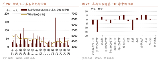 从ETF净申购来看,ETF净赎回,宽指ETF以净赎回为主,其中沪深300ETF赎回最多;行业ETF申赎参半,其中信息技术ETF申购较多,医药ETF赎回较多。具体来看,股票型ETF总体净赎回6.0亿份。其中,沪深300、创业板ETF、中证500ETF、上证50ETF、双创50ETF和科创50ETF分别净赎回15.0亿份、净申购3.6亿份、净赎回1.1亿份、净赎回11.2亿份、净赎回0.4亿份、净申购4.4亿份。行业方面,信息技术ETF净申购5.9亿份;消费ETF净赎回1.6亿份;医药ETF净赎回13.0亿份;券商ETF净申购1.9亿份;金融地产ETF净申购5.9亿份;军工ETF净申购5.9亿份;原材料ETF净申购0.7亿份;新能源&智能汽车ETF净赎回0.1亿份。