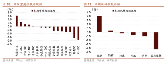 本周A股主要指数涨少跌多。主要指数中,大盘价值、上证50和沪深300表现较好,分别上涨1.54%,0.62%和0.32%;消费龙头、科创50和北证50表现相对较差,分别下跌0.80%、1.66%和1.89%。