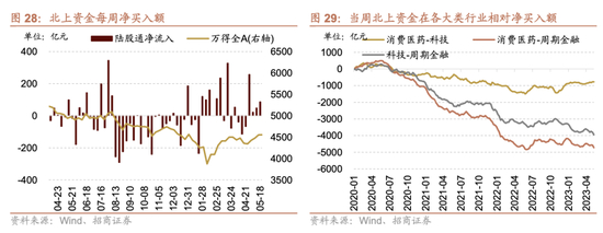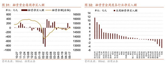 本周(5月13日-5月17日)北向资金净流入87.6亿元,净买入额扩大39.2亿元。行业偏好上,北上资金净买入规模较高的为银行、电子、非银金融等,分别净买入25.8亿元、20.1亿元、11.9亿元;集中卖出通信、传媒、有色金属等,净卖出规模达-6.0亿元、-3.1亿元、-2.6亿元。