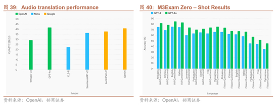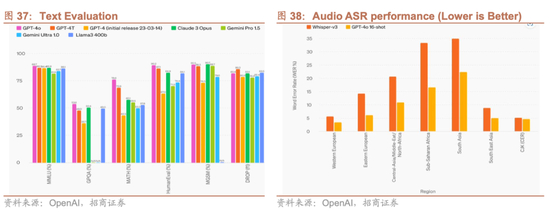 GPT-4o在所有语言,尤其是资源较少的语言方面,大幅提升了相对于Whisper-v3的语音识别性能。