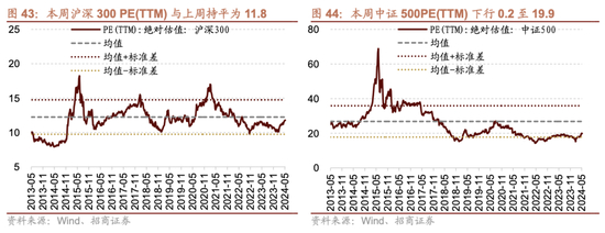 本周全部A股估值水平较上周下行。截至5月17日收盘,全部A股PE(TTM)为14.6,处于历史估值水平的42.9%分位数。创业板PE(TTM)下行0.5至30.3,处于历史估值水平的4.9%分位数。代表大盘股的沪深300指数PE(TTM)与上周持平为11.8,处于历史估值水平的49.6%分位数。代表中小盘股的中证500指数PE(TTM)下行0.2至19.9,处于历史估值水平的27.4%分位数。