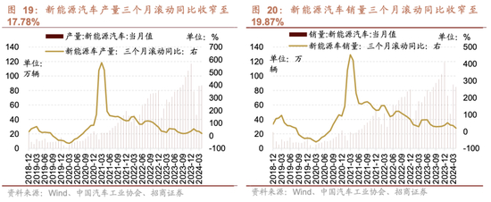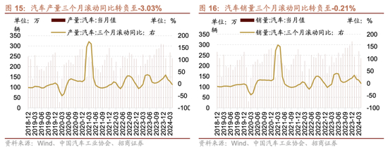 2024年4月汽车产量同比增幅扩大,销量同比增幅收窄,三个月滚动同比转负。根据中国汽车工业协会数据,4月份,汽车产销分别完成240.6万辆和235.9万辆,环比分别下降10.46%和12.45%,同比分别增长12.80%和9.30%,产量增速较前值提升8.8个百分点,销量增速较前值下降0.6个百分点,三个月滚动同比转负至-3.03%、-0.21%。1-4月份累计汽车产销分别完成901.2万辆和907.9万辆,同比分别增长7.9%和10.2%。