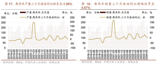4月份乘用车产销量三个月滚动同比下行。根据中国汽车工业协会数据,4月乘用车产销分别完成204.8万辆和200.1万辆,环比分别下降8.97%和10.52%,同比分别增长15.20%和10.50%,产量三个月滚动同比转负至-1.96%,销量三个月滚动同比增幅收窄至0.67%。1-4月份累计乘用车产销分别完成765.8万辆和768.9万辆,同比分别上涨8.6%和10.6%。