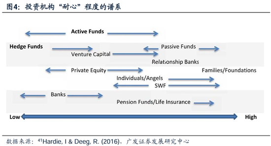 第一,我们首先从学术角度梳理耐心资本这一概念的形成。这一概念来源于比较政治经济学的研究,Richard Deeg, IainHardie(2016)将“耐心资本”定义为可以容许企业不以牺牲长期收益为代价对短期财务利益做出反应的股权或债权投资。Victoria Ivashina, Josh Lerner在著作《Patient Capital》中介绍了符合耐心资本特征的一些案例,包括养老金、主权财富基金、大学捐赠基金以及一些个人和家庭投资等。