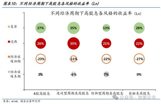 (1)经济复苏时期:高股息各板块均明显上涨,进攻型周期类高股息表现出色(35%),金融类高股息和A股高股息次之(28%和27%),防御型周期类高股息涨幅垫底(13%)。各板块盈利增速较高,估值扩张幅度最大。