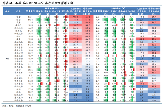 行业方面,本周(06.03-06.07)各行业估值普遍下调。从PE-TTM来看,仅公用事业(+2.5%)、交通运输(+1.1%)行业估值有所提高,而综合(-4.4%)、社会服务(-4.2%)、传媒(-3.9%)等估值明显降低。