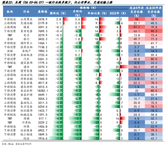 行业方面,本周(06.03-06.07)一级行业跌多涨少,仅公用事业(+2.8%)、交通运输(+1.1%)上涨,综合(-7.4%)、轻工制造(-5.8%)、社会服务(-5.7%)领跌。上涨行业原因:(1)公用事业:绿电企业受益于国家能源局《关于做好新能源消纳工作 保障新能源高质量发展的通知》等政策支持,高股息、夏季用电高峰保供、电网出海逻辑同样驱动电力概念上涨;(2)交通运输:受益于交通运输部等十三部门印发《交通运输大规模设备更新行动方案》政策端支持。领跌行业原因:(1)综合、轻工制造:资金基于退市预期规避小微盘,小市值股票遭遇资金出逃;(2)社会服务:小盘风格调整,叠加消费景气较弱。