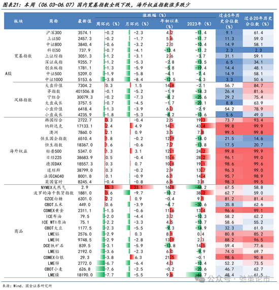 A股方面,本周(06.03-06.07)A股主要宽基指数估值多数下调,仅沪深300(+0.2%)估值小幅提高,中证1000(-3.4%)、中证500(-1.7%)、创业板指(-1.3%)估值领跌。从过去20年PE-TTM历史分位数来看,创业板指、中证500处于较低历史分位数水平。海外方面,本周海外市场主要指数估值涨多跌少,仅英国富时(-4.0%)估值下降,纳斯达克(+2.6%)、恒生国企指数(+2.1%)估值涨幅居前;道琼斯、标普500估值处于较高历史分位数水平。
