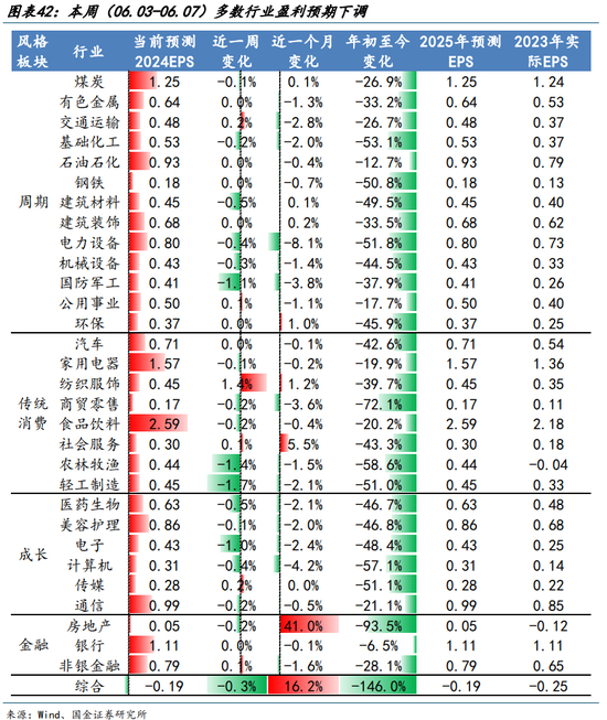 行业方面,本周(06.03-06.07)多数行业盈利预期下调。传统消费中仅纺织服饰(+1.4%)、社会服务(+0.1%)盈利预期有所上调,轻工制造(-1.7%)、农林牧渔(-1.4%)盈利预期下调幅度居前;周期板块中仅交通运输(+0.2%)、公用事业(+0.1%)盈利预期小幅改善,国防军工(-1.1%)、建筑材料(-0.5%)等盈利预期遭到下调;成长板块中仅传媒(+0.2%)盈利预期上调,电子(-1.0%)盈利预期降低较多;金融板块中非银金融(+0.1%)盈利预期小幅上调。