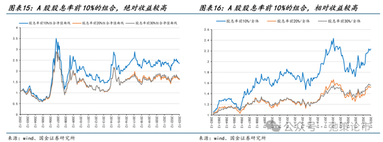 长期看,A股股息率前10%的高股息组合明显跑赢股息率前20%、前30%的高股息组合和全体A股。我们统计了2003年以来A股股息率前10%的高股息组合、前20%的高股息组合、前30%的高股息组合和全体A股组合的收益表现(流通市值加权,每个自然年末调仓),发现股息率前10%的高股息组合收益表现最优,但股息率前20%、和前30%的高股息组合收益相差不大。