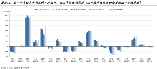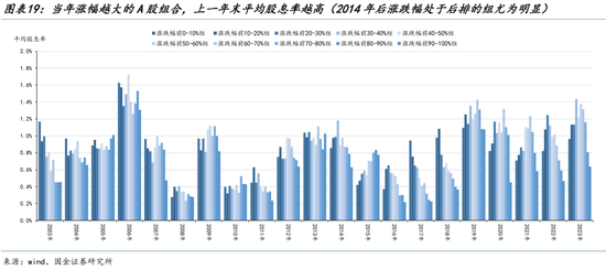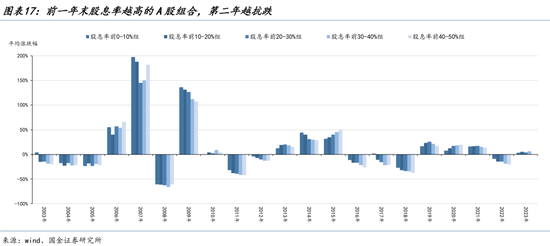 对于涨跌幅处于中后排的组,涨跌幅越靠前,股息率往往越高。将全体A股按照涨跌幅分为10组,对于涨跌幅处于中后排的组,从2014年开始,当年涨幅越大的A股组合,上一年末平均股息率越高;三年内涨幅越大的A股组合,三年前平均股息率越高。值得注意的是,以上规律在涨跌幅处于后排的组中尤为明显,表明在涨幅高的股票组合中高股息率因子不是主导因素,市场可能更关注其成长性,而在涨幅低股票组合中高股息率因子较为关键,因当投资该股票的资本利得较低时,确定性更高的分红收益更为稀缺。