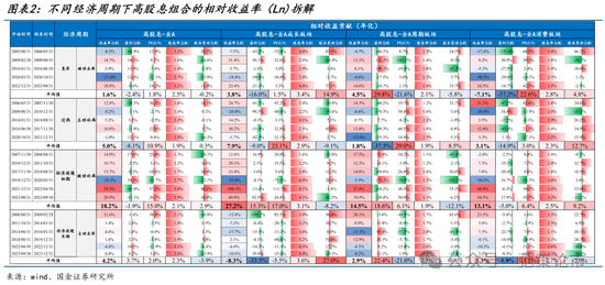 根据2.2.1中所讲,我们对2005年以来不同经济周期下,A股高股息组合、全A、成长板块、周期板块和消费板块的绝对收益表现(对数收益率)进行了复盘总结,并对各板块的收益来源进行了详细拆分,得到了如下结论: