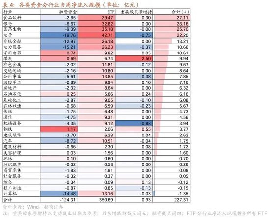 【资金·众寡】融资净流出, ETF持续净申购。本周融资资金前四个交易日合计净流出92.1亿元;新成立偏股类公募基金34.1亿份,较前期上升18.8亿份;ETF净申购,对应净流入351.8亿元。行业偏好上,北上资金无净买入行业;融资资金净买入钢铁、家用电器、煤炭等;医药ETF申购较多,券商ETF赎回较多。重要股东由净减持转为净增持,计划减持规模下降。