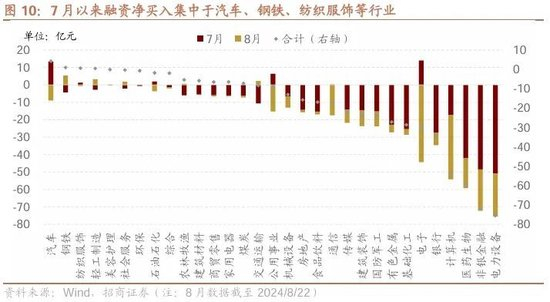 从融资资金行业净流入看,7月以来融资资金整体净流入汽车、钢铁、纺织服饰、轻工制造等行业,持续流出电力设备、非银金融、医药生物等。其中,汽车、公用事业、电子由7月的净流入转为8月的净流出。