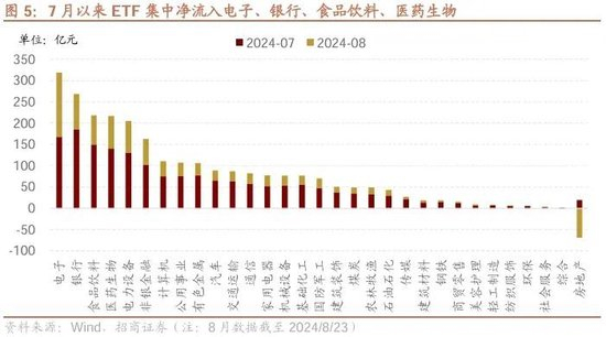 ETF规模的持续扩张已成为A股市场的重要变量。从结构上看,近两年规模型ETF的占比逐步回升,当前已占据绝对比例。由于ETF跟踪的指数大多以成分股流通市值或调整市值加权,因此股票型ETF的规模扩张能够给权重相对更大的龙头个股贡献增量资金,对大盘龙头风格具有明显的强化作用。从ETF行业拆分上看,7月以来ETF集中净流入电子、银行、食品饮料、医药生物等行业。