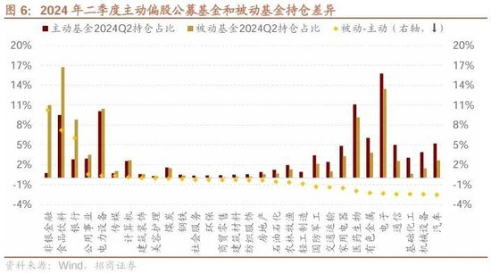 从二季度主被动基金持仓差异看,被动基金持仓占比较高的行业主要集中在食品饮料、电子、非银金融等行业,相对于主动基金而言,被动基金明显超配的行业主要集中在非银金融、食品饮料、银行、公用事业等行业。以ETF为代表的被动基金持续净申购为被动基金超配行业提供增量资金,使得部分行业超额收益相对显著。
