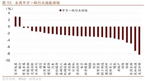 从行业上看,本周申万一级行业涨跌分化,家用电器、银行上涨,医药生物、农林牧渔、美容护理等跌幅居前。从涨跌原因看,本周强势板块主要原因,家用电器(避险情绪上升)、银行(经营与分红稳定,工建中交四行受到市场青睐,股价再创新高)、有色金属(美国硬着陆预期下降,有色金属反弹);跌幅较大的行业原因,医药生物(部分公司业绩miss,把板块承压),农林牧渔(市场正常轮动),美容护理(经济数据承压,板块走弱)。