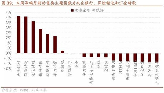 本周A股市场下跌。万得全A本周下跌2.05%,沪深300下跌0.55%,创业板指下跌2.80%。A股涨幅居前的重要主题指数为央企银行、保险精选和汇金特股。