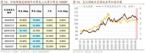 随着美国通胀的回落和劳动力市场降温,以及鲍威尔明显转鸽,美联储货币政策转向已经确定。当前,市场预期美联储9月大概率会降息,主要分歧在于9月降息幅度是25BP(概率24%)还是50BP(概率76%)。此外,对于后续降息路径上,市场预期年内降息三次且累计降息100BP,不过鲍威尔本次讲话并没有明确阐述未来降息幅度和频率,降息的时机和速度仍将取决于未来的经济数据。