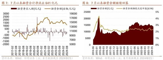 截至2024年8月22日,融资余额1.39万亿元,7月以来融资合计净流出641亿元,融资余额占A股流通市值的比例为2.32%,处于2016年以来的60.39%分位。7月以来市场震荡走低,融资资金延续净流出态势,融资余额继续回落。