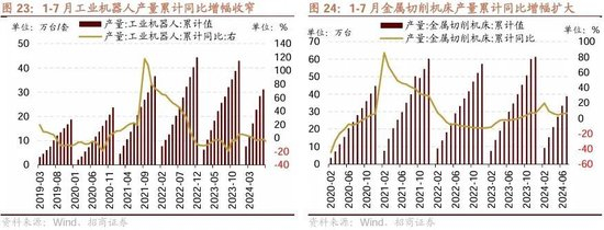 1-7月工业机器人产量累计同比增幅收窄,三个月滚动同比增幅收窄。7月工业机器人产量4.55万台/套,当月同比增幅扩大7.30个百分点至19.70%,三个月滚动同比增幅收窄2.07个百分点至15.40%;1-7月工业机器人累计产量31.1万台/套,累计同比增幅收窄1.70个百分点至7.90%。