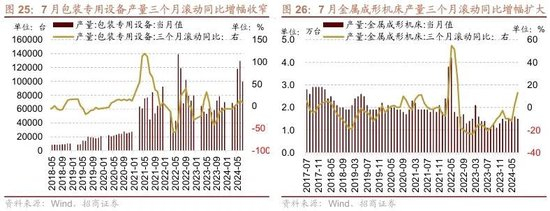 1-7月包装专用设备产量累计同比增幅收窄,三个月滚动同比增幅收窄。1-7月包装专用设备产量累计值为75.08万台,同比增幅收窄2.6个百分点至5.20%;7月包装专用设备产量当月值为9.96万台,同比由正转负至-6.30%(前值为23.50%),三个月滚动同比增幅收窄5.80个百分点至7.77%。