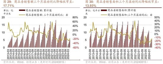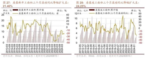 1-7月份房屋新开工面积累计同比降幅收窄,房屋竣工面积累计同比降幅持平;商品房销售额、商品房销售面积累计同比降幅收窄;房地产开发投资完成额累计同比降幅扩大。1-7月份房屋新开工面积累计值为4.37亿平方米,同比下行23.20%,降幅较前值收窄0.5个百分点,三个月滚动同比扩大至-21.46%(前值-19.48%)。1-7月份房屋竣工面积累计值为3.00亿平方米,同比下行21.80%,降幅与前值持平,三个月滚动同比扩大至-24.25%(前值-22.24%)。