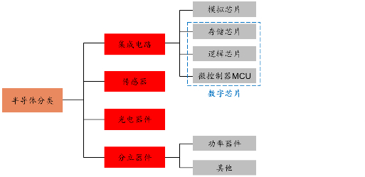 半导体器件按照国际通用产品标准可分为四类:集成电路、分立器件、传感器和光电器件。集成电路按照处理信号可分为数字芯片和模拟芯片,其中数字芯片按照使用功能分为存储芯片、逻辑芯片和微控制器MCU。分立器件主要为功率器件,包括IGBT、MOSFET、二极管和晶闸管等产品。