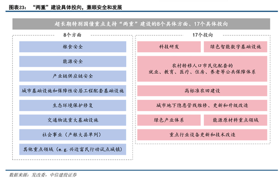 政策表态25年将加力支持“两重”建设,新型城镇化或是重点方向。“两重”建设是指国家重大战略实施和重点领域安全能力建设。2024年两会提出,从今年开始拟连续几年发行超长期特别国债,专项用于国家重大战略实施和重点领域安全能力建设(“两重”),具体包括8个方面、17个具体投向,主要涉及科技研发、绿色智能数字基础设施、农村转移人口市民化配套的就业/教育/医疗等公共保障体系、高标准农田建设、城市更新、能源原材料重点领域、重点行业设备更新和技术改造等方向。发改委自今年2月开始就已多次组织各地方相关部门梳理储备2024年能开工建设的超长期特别国债项目,万亿超长期特别国债于5月起陆续发行、提供资金支持,截至8月前两批“两重”建设项目清单下达。10 月 8 日国新办新闻发布会介绍,1 万亿元的超长期特别国债里用于“两重”建设的 7000 亿元已全部下达到项目,项目开工率是 50%;同时,将在年内提前下达明年1000亿元中央预算内投资计划和1000亿元“两重”建设项目清单,支持地方加快开展前期工作、先行开工实施;25年将继续发行超长期特别国债并优化投向,加力支持“两重”建设。经梳理,续建基础设施、农业转移人口市民化(重点是普通高中建设与医院病房改造)、高标准农田建设、地下管网建设、城市更新等领域增量资金需求较大。
