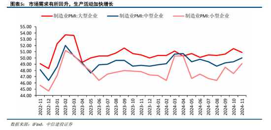 此外,11月份的数据显示,大型企业PMI为50.9%,中型企业PMI为50%,小型企业PMI为49.1%,表明不同规模的企业均有所改善,尤其是中型企业在连续6个月运行在50%以下后回到荣枯线,显示出市场需求有所回升,生产活动加快增长。