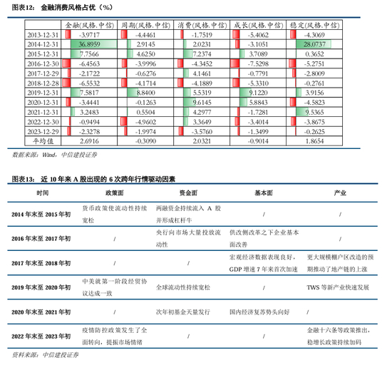 积极布局,备战跨年行情。受益于12月政策预期,A股市场往往存在跨年行情,单纯从统计角度来看,近十年内12-2月平均涨跌幅占优。其中,金融、消费风格板块为市场主线。根据前文所提,市场前期情绪过于悲观,对于边际利好反应明显,当下汇率、海外不确定性与政策预期等影响因素也有边际改善,A股本轮有望迎来相对更大级别的跨年行情。投资者可逢低布局,备战跨年行情。