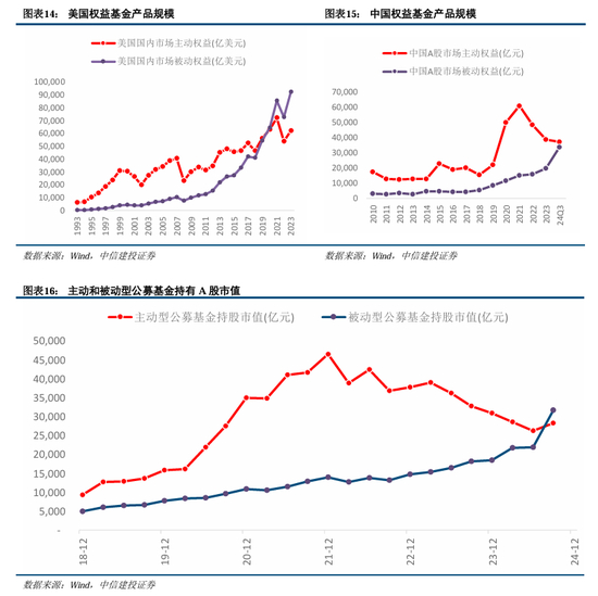 2023年,美国国内市场被动型权益基金产品规模达到9.23万亿美元,占比达到60%。2024Q3,A股市场被动型权益基金产品规模达到3.36万亿元,占比达到47%,相当于美国2018年水平。截至24Q3,被动型公募基金持股市值达到3.16万亿元(相当于全A自由流通市值的8.4%),超过主动型公募基金的2.82万亿元(相当于全A自由流通市值的7.5%)。