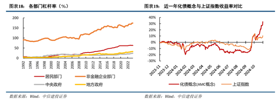 与化债行动相关的主体有望直接受益。截止2024年6月,中央政府杠杆率为24.6%,显著低于其他部门,中央政府杆杆率仍有一定提升空间。蓝部长强调“还有其他政策工具正在研究当中,中央财政还有较大的举债空间和赤字提升空间”,发行特别国债支持化债的国有大行、AMC、城投公司等相关企业,由于直接承担化债任务,在政策支持背景下,伴随着化债攻坚进一步深化,其资产质量有望进一步改善,并带动盈利能力增强。