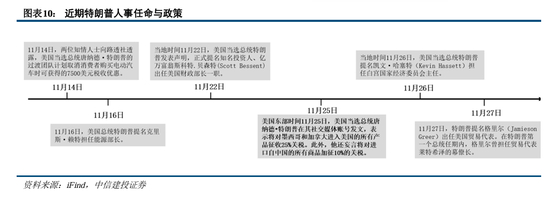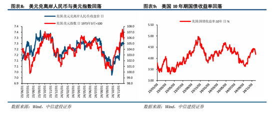 前期市场关注“特朗普交易”,美元指数、10年期国债利率均大幅上行,美元指数11月22日达到最高值107.49,10年期国债利率11月13日达4.44%。人民币承压,大幅贬值。近日,美元指数已阶段见顶回落,汇率边际修复。并且,前期市场对于美国10年期国债利率过度定价,现亦有所回落。前期“特朗普交易”下形成的海外不利因素均出现边际改善。