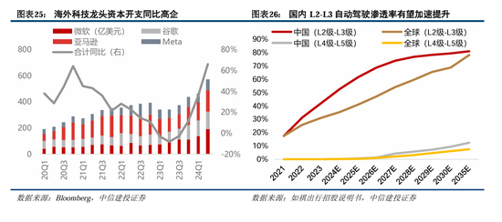 AI+:下游应用有望加速爆发,上中游算力景气度确定。苹果Apple Intelligence及AR眼镜加持,科技巨头持续完善AI软硬件生态,传统手机笔电有望受益于AI生态成熟后的换机,应用亦有望加速铺开。海外科技巨头AI资本开支持续超预期,且表态将进一步上行,24Q2微软/亚马逊/谷歌/META四者资本开支合计同比+59%,带动算力产业链相关企业订单饱满、业绩高增。