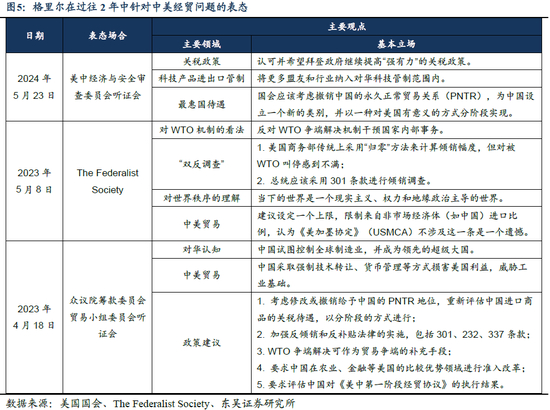 贸易政策料将延续特朗普1.0时期的主要特点,但仍会出现新特征。整体上,格里尔既表现为典型的MAGA人士,还存在一定的现实主义战略鹰派色彩。在关税立场上,格里尔同特朗普1.0时期政策保持高度一致,试图将高额关税作为美国制造业回流的工具,而中美之间的一阶段协议或成为任内摩擦的导火线;在政策实践上,格里尔仍可能延续特朗普1.0时期关于中美公平贸易的谈判主线,而不同之处在于,格里尔可能更为激进地将中国的永久正常贸易关系地位作为关键施压工具。此外,在科技竞争方面,格里尔或主张对拜登政府的“小院高墙”策略进行调整,将更广泛的高科技产品以及更多的经贸盟友纳入限制对华出口的范畴,以更加全面地应对中国在高科技领域的挑战。